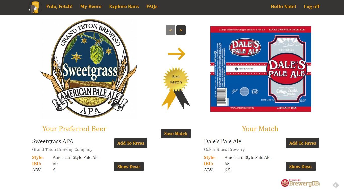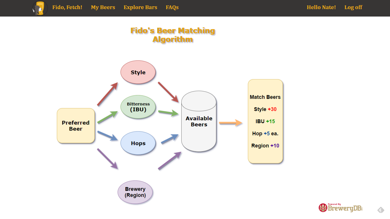 After a user chooses a beer they know they would enjoy, Fido compares the attributes of the prefered beer to those available at the drinker's location. Fido then returns the best match for the user's taste.