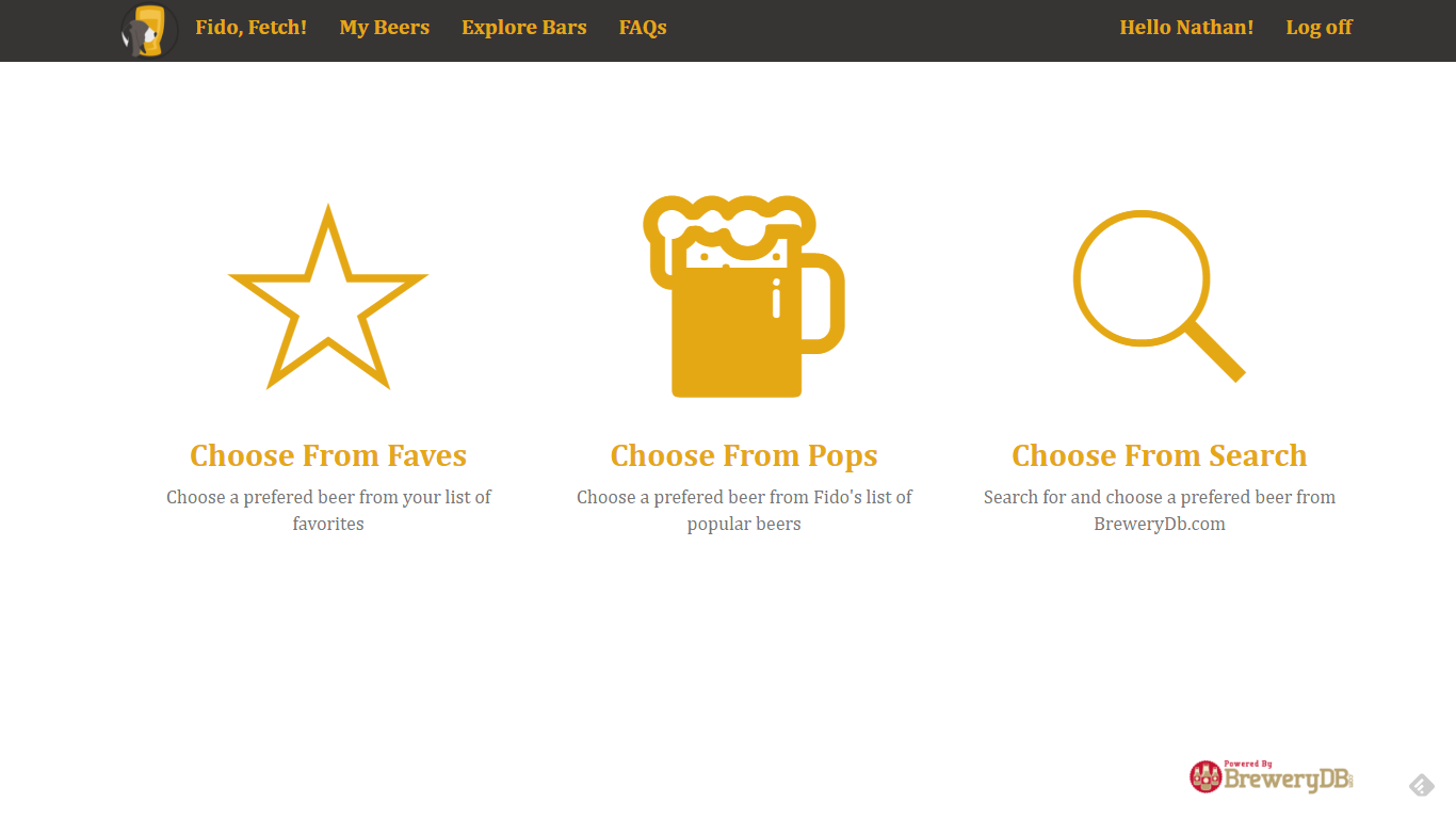 Fido allows a user to chose their preferred beer in three ways: a list of favorites, a list of nationally available beers or a search for a different beer.