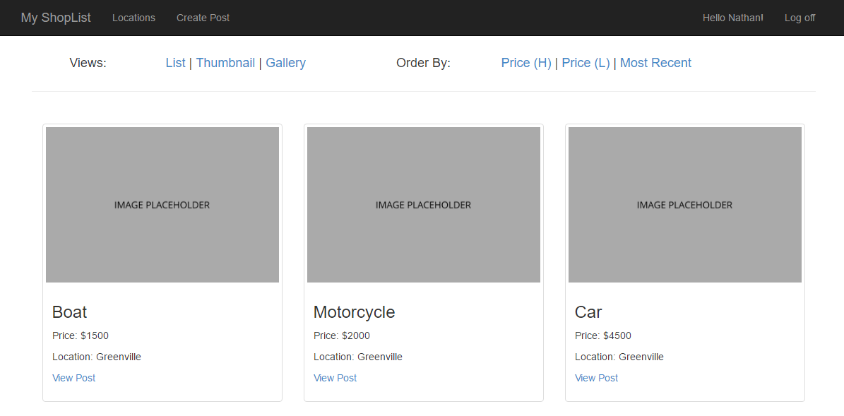 Items may be filtered by price and date listed, and displayed through list, thumbnail, and gallery views.